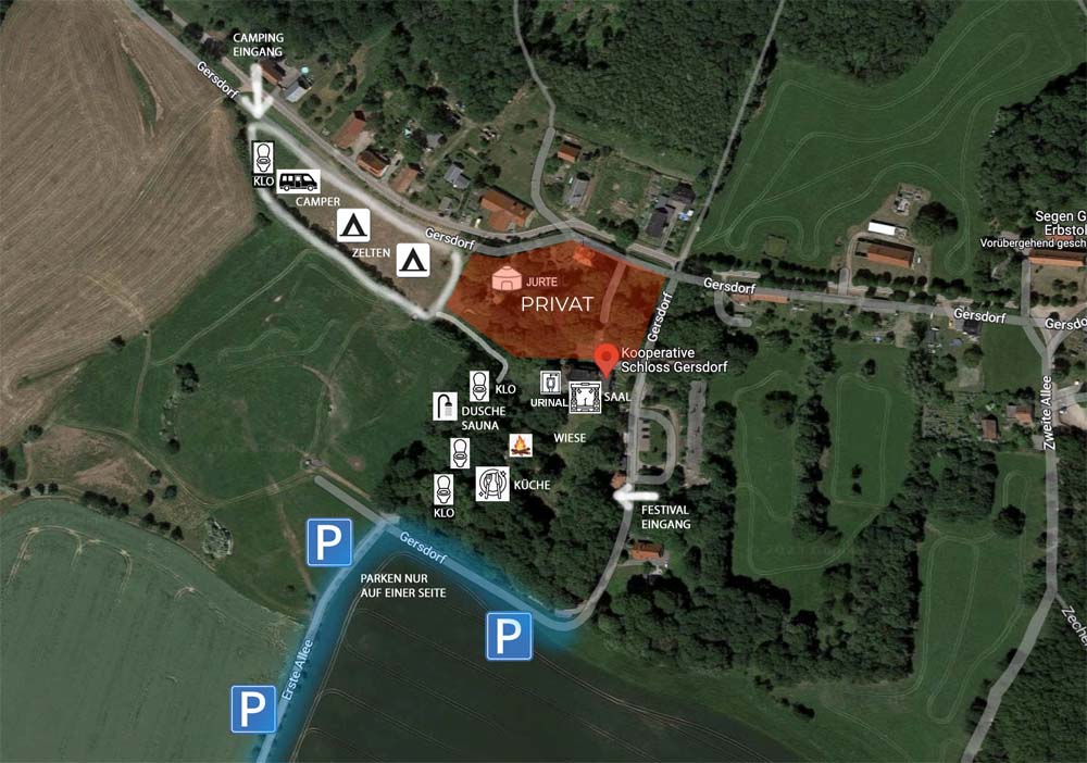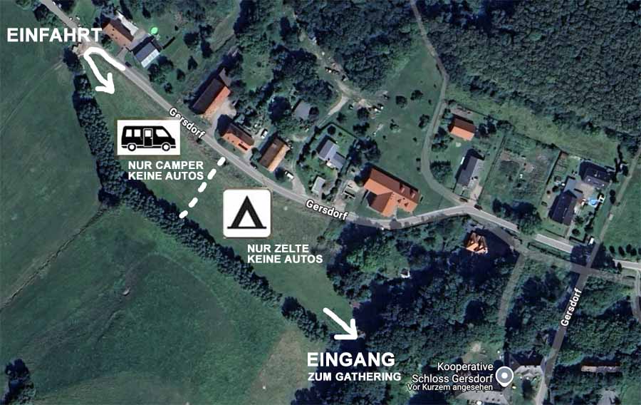 ANFAHRT & ORT: Du kannst Gersdorf per Auto (Camping Einfahrt bei Google Maps) oder mit öffentlichen Nahverkehr erreichen. Die Adresse ist Kooperative Schloà Gersdorf, Gersdorf 23, 09661 Striegistal. Die Fahrt vom Hauptbahnhof nach Gersdorf dauert mit dem Bus ca. 90min. Achtung, es gibt mehrere Gersdorfe in Sachsen. Unser Gathering liegt bei Nossen.